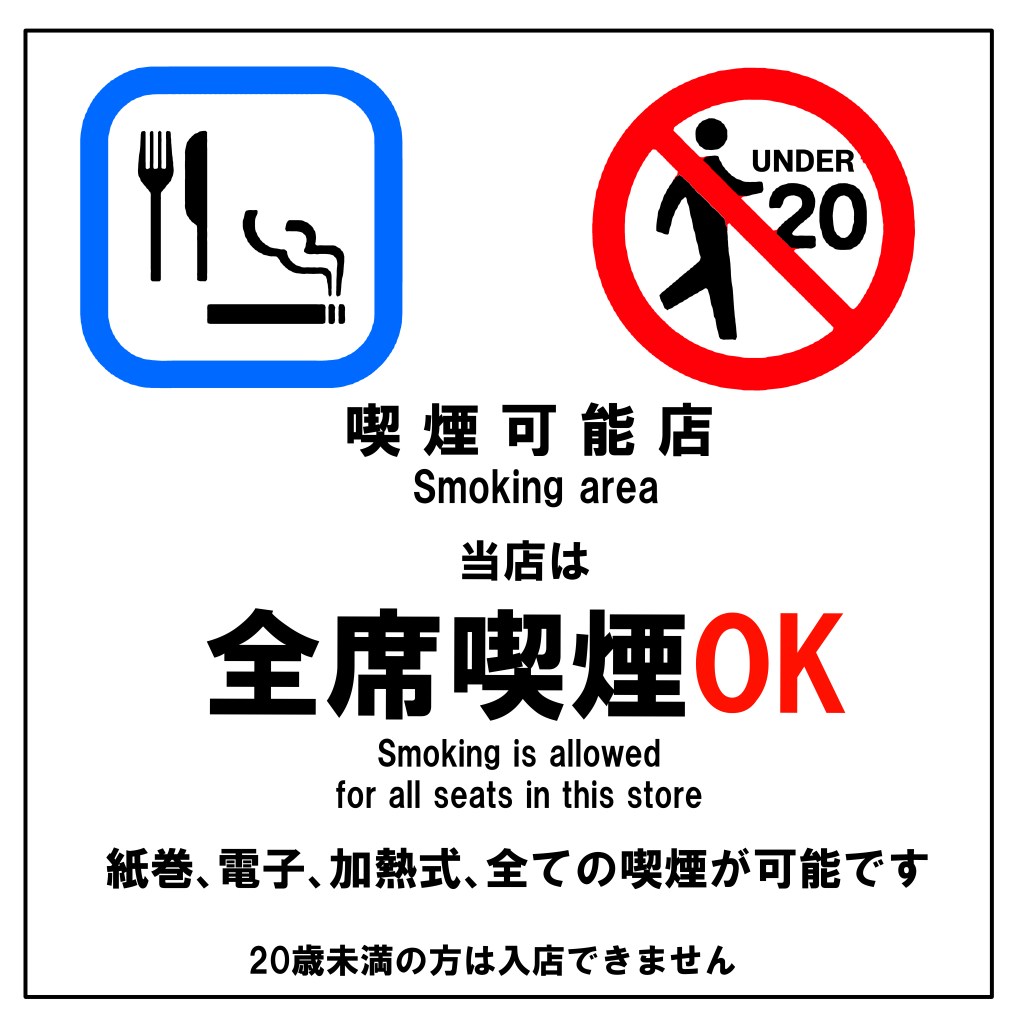 当店の全席にて喫煙が可能です全席で紙巻、電子、加熱式の喫煙が可能です分煙席、禁煙席は準備しておりません喫煙のできる店なので20歳未満の方は入店する事ができません未成年者の健康を守る為とご理解いただければと存じます